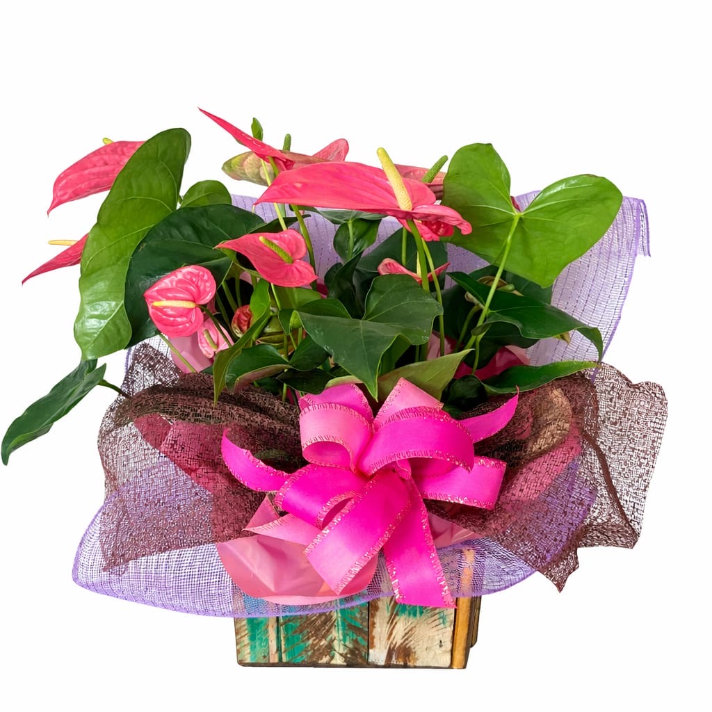 Antúrio rosa com renda lilás e marrom, laço TNT pink e cachepot madeira.