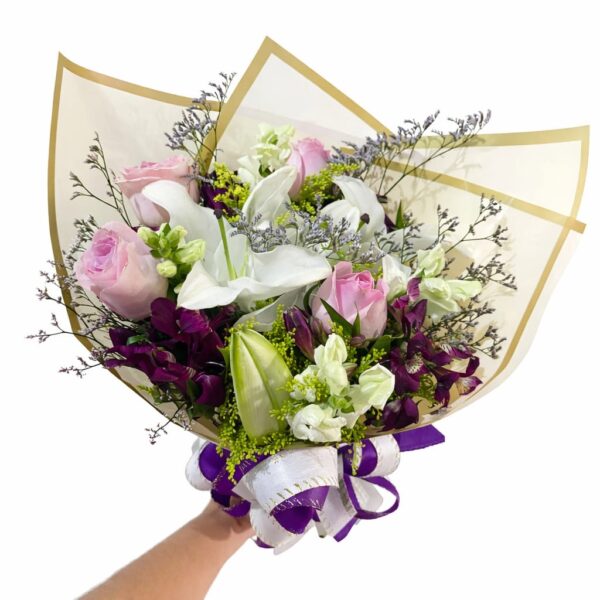 O Mini Buquê Lírio Encanto é uma composição delicada e elegante, formada por 4 rosas cor de rosa, alstroemérias roxa, boca de leão branco, lírio branco e tango, criando um visual leve e harmonioso. A embalagem lisa branca com dourado valoriza a sofisticação das flores, enquanto o laço de TNT roxo e branco finaliza com um toque encantador.