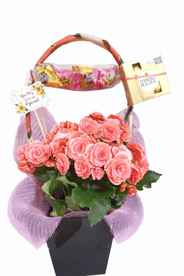 Begônia rosa com chocolates Ouro Branco, Sonho de Valsa e Ferrero em cesta madeira.