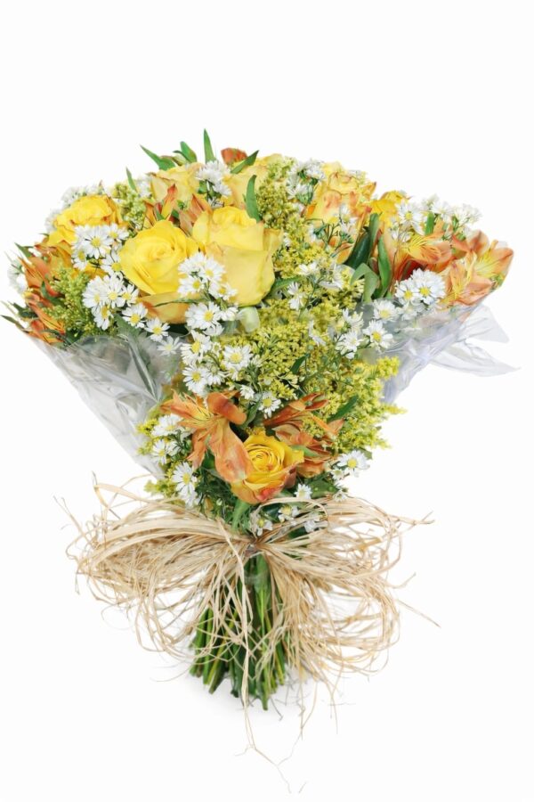 Vibrante e cheio de alegria, o Buquê Encanto é uma escolha perfeita para iluminar momentos especiais com cores e delicadeza. Composto por 12 rosas amarelas importadas, alstroemérias laranjas e amarelas, acompanhadas por hastes de tango e áster que trazem leveza e harmonia ao arranjo, ele transmite uma proposta moderna e encantadora. Finalizado com embalagem transparente e laço em ráfia, valoriza a beleza natural das flores, sendo ideal para presentear com carinho e surpreender de forma especial
