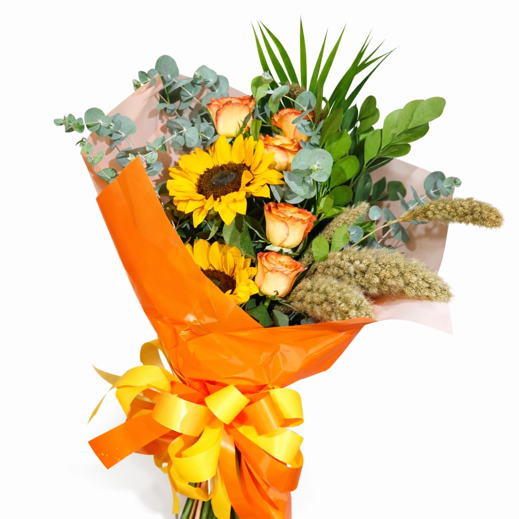Vibrante e cheio de personalidade, o Buquê Encanto Dourado é uma escolha perfeita para transmitir alegria e elegância em cada detalhe. Composto por 5 rosas laranja, 2 girassóis, trigo chinês, murta e eucalipto que trazem leveza e movimento ao arranjo, ele destaca uma combinação quente e encantadora. Finalizado com embalagem lisa laranja e laço liso amarelo, valoriza ainda mais sua apresentação, sendo ideal para presentear em momentos especiais.