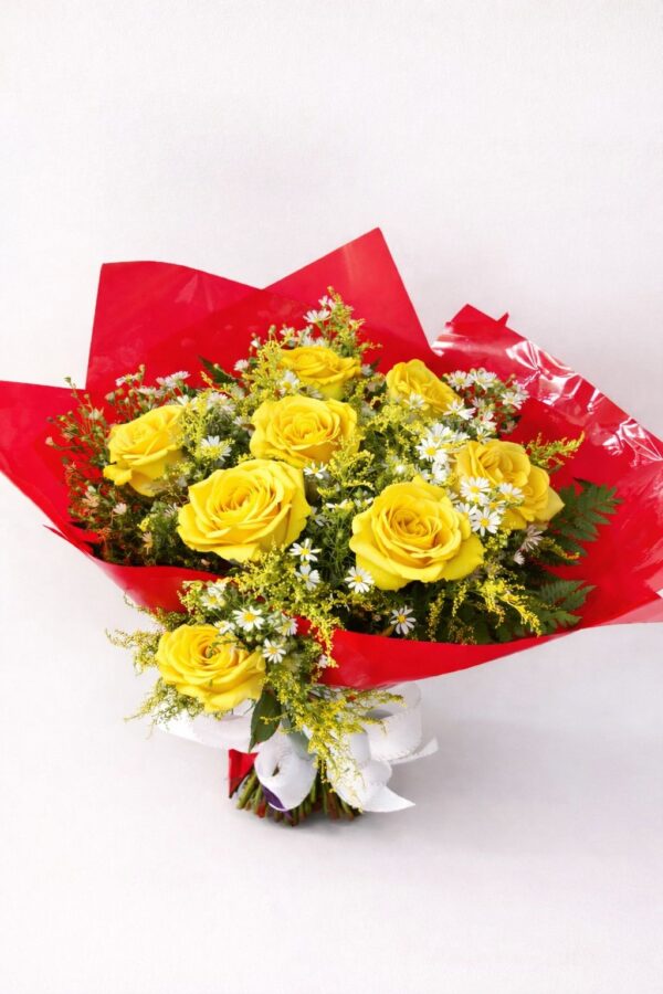Buquê com 12 rosas amarelas nacionais, tango e áster, finalizado em embalagem lisa vermelha com laço TNT branco— romântico, delicado e perfeito para presentear.
