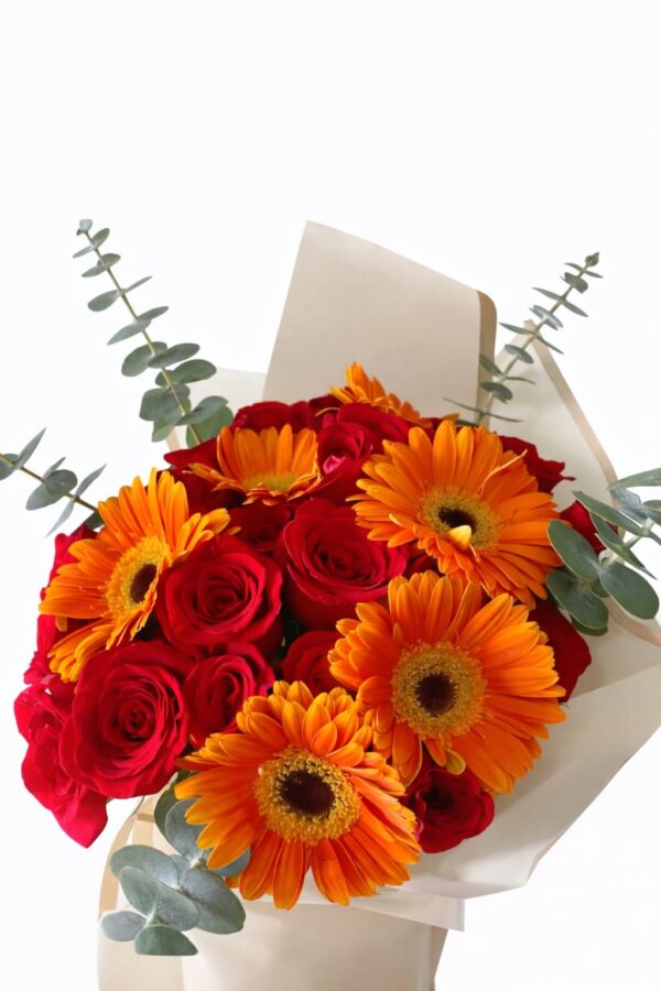 O Buquê Gérberas e Rosas Vermelhas é uma composição intensa e sofisticada, formada por 12 gérberas laranja, 20 rosas vermelhas importadas e toques de eucalipto, criando um visual marcante e elegante. A embalagem lisa creme com dourado valoriza a beleza das flores, enquanto o laço liso laranja com vermelho finaliza com um toque vibrante e apaixonante.