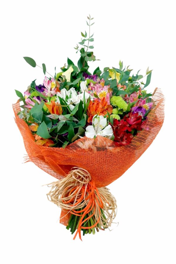 Buquê com mix de alstroemérias branca, amarela, laranja, roxa, vermelha e rosa com eucalipto, finalizado em embalagem renda laranja com laço ráfia — leve, colorido e perfeito para presentear.