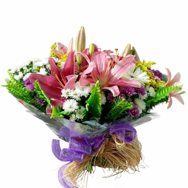 O Buquê Lírio Rosé Silvestre é uma composição delicada e elegante, formada por 6 hastes de lírio rosa, áster mariano, verde paulistinha, verde samambaia, alstroemérias pink e gérbera branca, criando um visual leve e harmonioso. A embalagem transparente valoriza a beleza natural das flores, enquanto o laço de renda lilás com ráfia finaliza com um toque romântico e encantador.