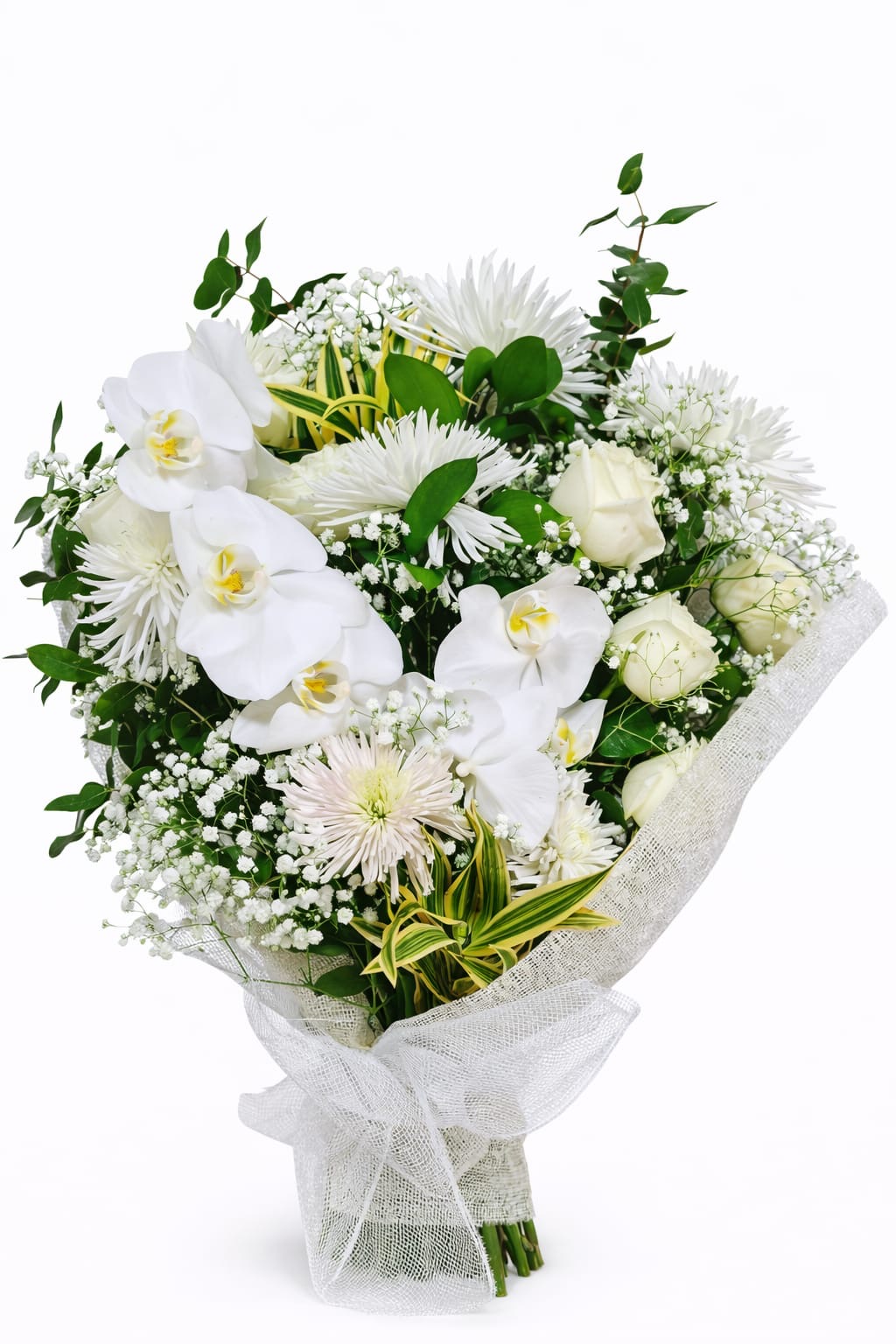 O Buquê Silvestre Orquídea é uma composição elegante e delicada, formada por 5 anastácias brancas, duas hastes de orquídea branca, gipsofila, eucalipto e dracena pleomele, criando um visual leve e sofisticado. A embalagem de renda branca valoriza a beleza das flores, enquanto o laço de renda branca finaliza com um toque refinado e harmonioso.