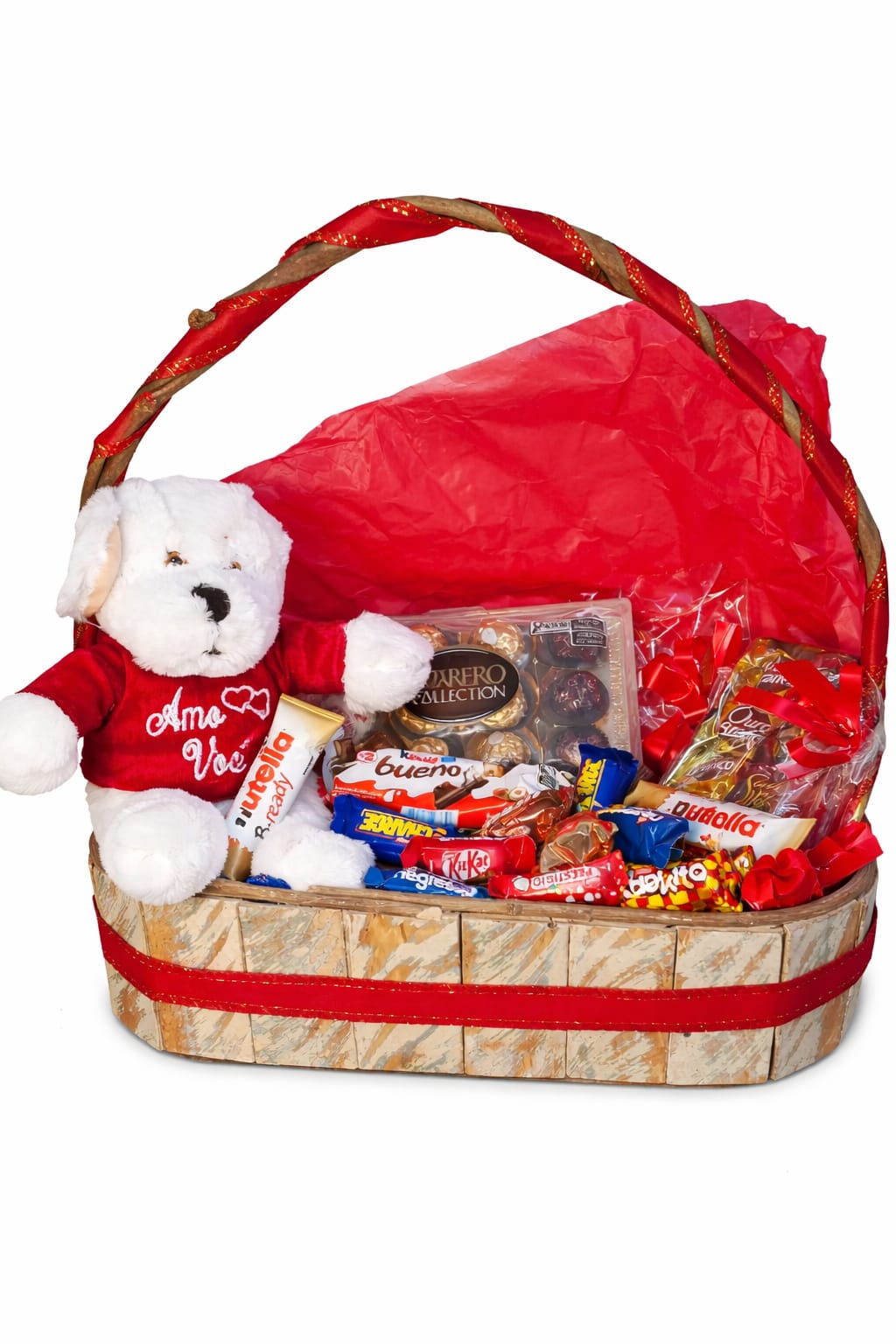 Cesta composta por pelúcia, Ferrero Collection, Ferrero Rocher, Nutella B-ready, Kinder Bueno e diversos chocolates sortidos. Montada em cesta estruturada com acabamento em tons de vermelho, é uma opção sofisticada e marcante para surpreender quem você ama.