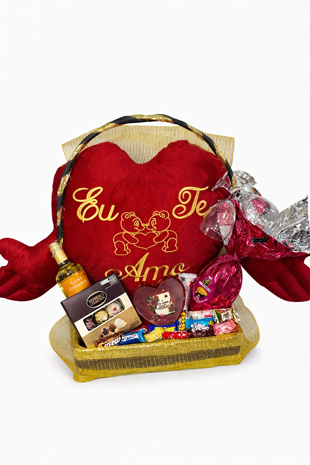 Cesta composta por almofada, bebida, Ferrero Rocher, ovo de Páscoa, coração de acrílico com bombom e bombons sortidos. Montada em cesta decorada com acabamento em tons de vermelho e dourado, é uma opção completa e sofisticada para presentear.