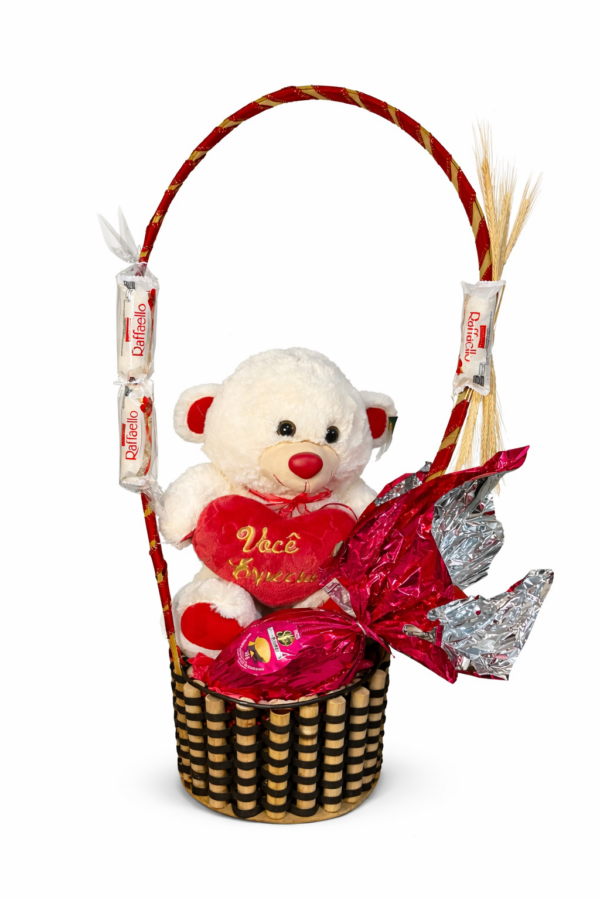Cesta composta por urso de pelúcia com coração “Você é especial”, ovo de Páscoa e chocolates. Montada em cesta decorada com acabamento em tons de vermelho, é uma opção ideal para presentear de forma carinhosa.