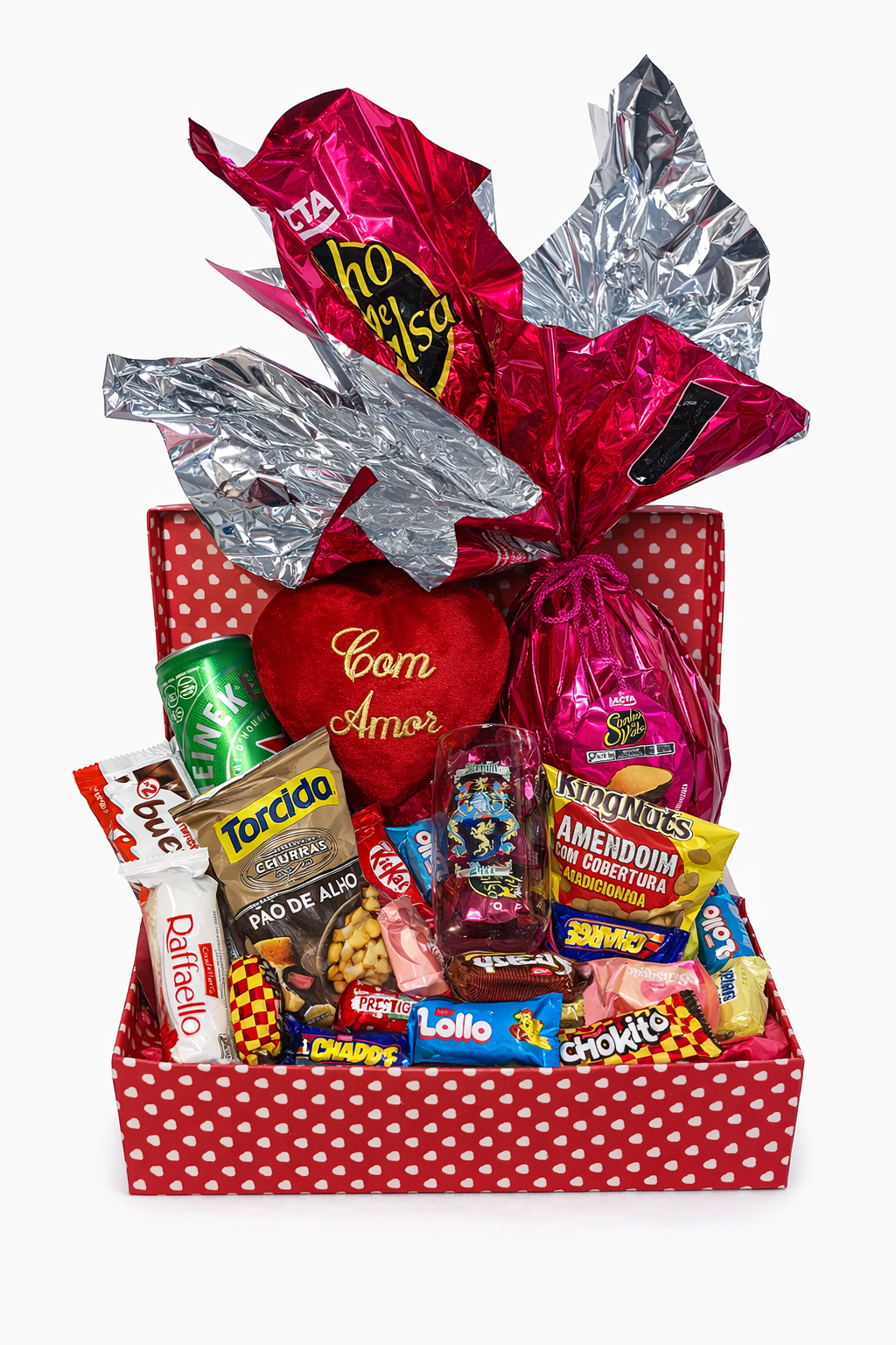 Cesta composta por almofada, bebida, ovo de Páscoa, chocolates variados, salgadinhos e itens diversos. Montada em cesta decorada com acabamento em tons de vermelho, é uma opção completa para presentear.