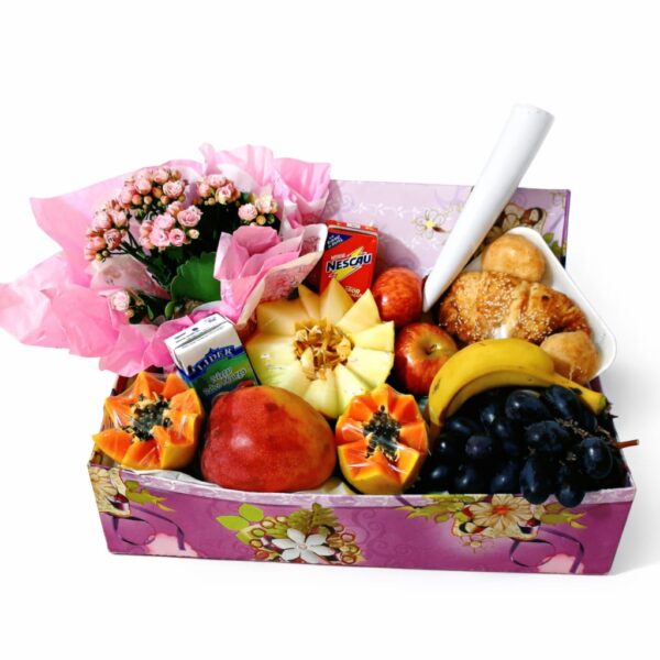 Delicada e cheia de carinho, a Cesta Doce Rosé é uma escolha perfeita para tornar o início do dia ainda mais especial. Composta por croissant, três pães de queijo, uma mini esfirra, duas maçãs, manga, mamão, cacho de uva, suco e achocolatado (frutas podem sofrer alterações conforme época de produção e ponto de amadurecimento), ela oferece uma experiência leve e saborosa. Acompanha uma mini calandiva apoiada em embalagem lisa cor-de-rosa, trazendo um toque floral encantador ao presente. Finalizada em caixa com estampa conforme disponibilidade em estoque, saco transparente e laço em TNT cor-de-rosa, valoriza uma apresentação delicada e elegante.