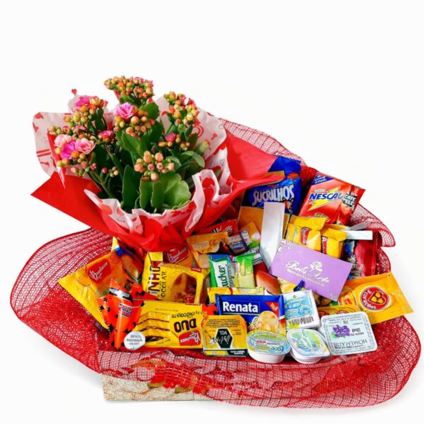 Delicada e cheia de carinho, a Cesta Encanto Matinal é uma escolha perfeita para começar o dia com sabor e afeto. Composta por um kit especial contendo bolachas doces e salgadas, chá, café, achocolatado, suco, mini torrada, mini bolo, sucrilhos e geleias cuidadosamente organizados, ela traz uma proposta prática e encantadora. Acompanha uma mini calandiva que acrescenta um toque floral ao presente. Finalizada em caixa com estampa sujeita à alteração conforme disponibilidade em estoque, decoração em renda vermelha, saco transparente e laço em TNT vermelho, valoriza ainda mais sua apresentação.