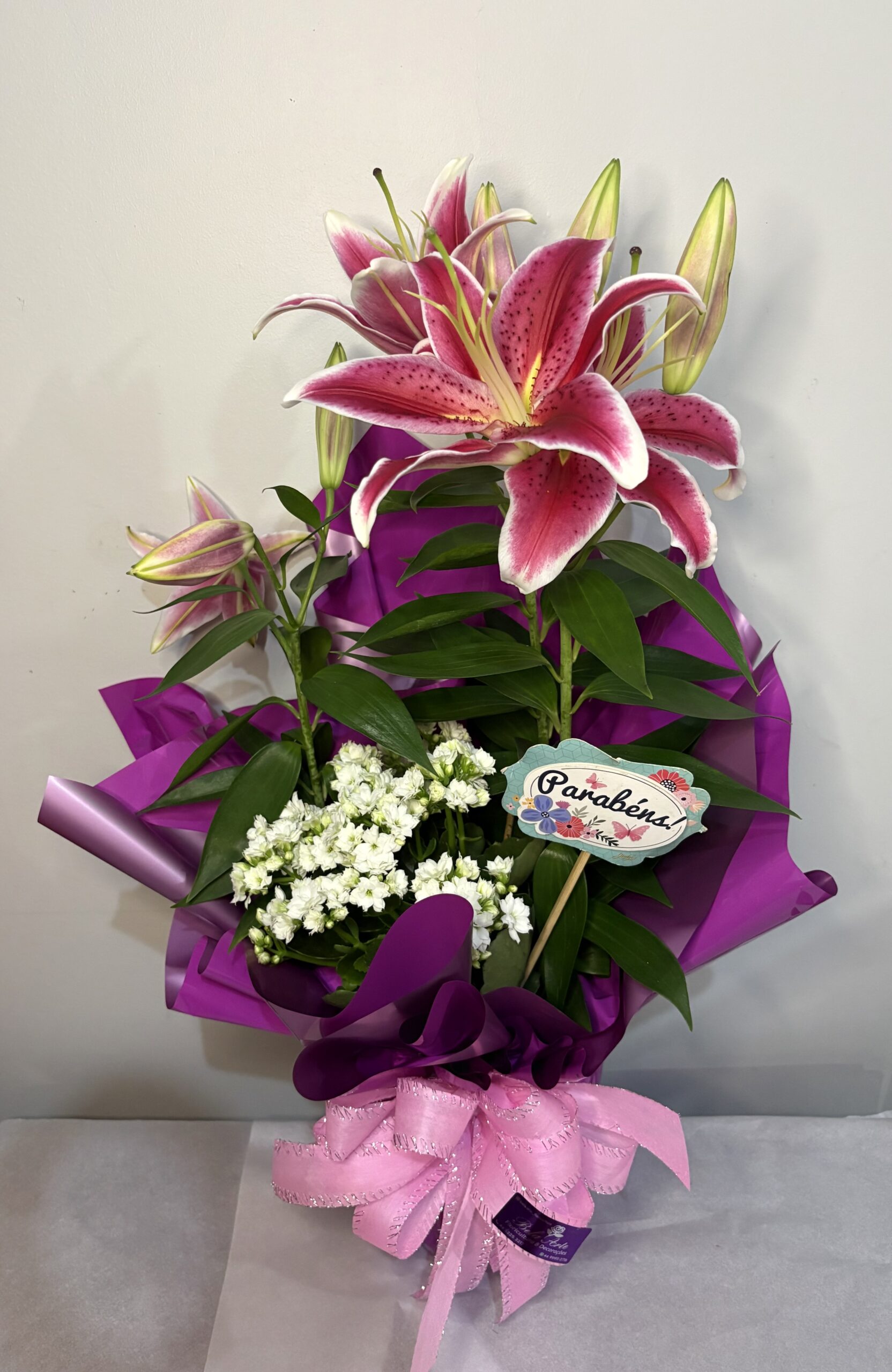 Lírio no vaso decorado com 1 calandiva e 1 plaquinha de sua escolha