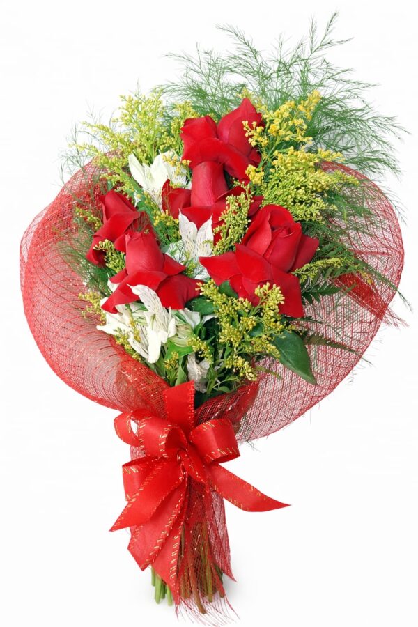 O Mini Arranjo Frontal Paixão é uma composição intensa e elegante, formada por 5 rosas vermelhas importadas acompanhadas por aspargo, tango e alstroemérias brancas, criando um visual romântico e harmonioso. A embalagem de renda vermelha valoriza a beleza das flores, enquanto o laço de TNT vermelho finaliza com um toque sofisticado e apaixonante.