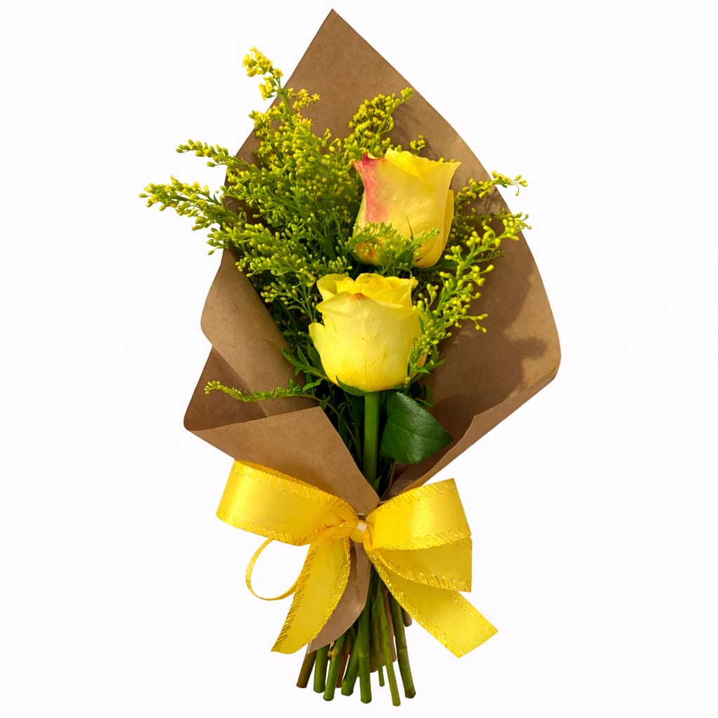 O Mini Arranjo Sol Encantado é uma composição delicada e alegre, formada por duas rosas amarelas importadas acompanhadas por tango, criando um visual leve e harmonioso. A embalagem em papel kraft valoriza o estilo natural do arranjo, enquanto o laço de ráfia finaliza com um toque rústico e encantador.