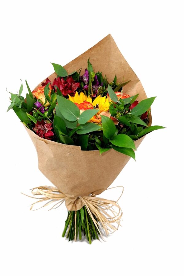 O Mini Buquê Charme Green é uma composição vibrante e natural, formada por um mix de flores com 1 girassol, alstroemérias nas cores roxa, marsala e vermelha, 3 rosas laranja e verde samambaia, criando um visual alegre e harmonioso. A embalagem em papel kraft valoriza o estilo rústico do buquê, enquanto o laço de ráfia finaliza com um toque delicado e encantador.