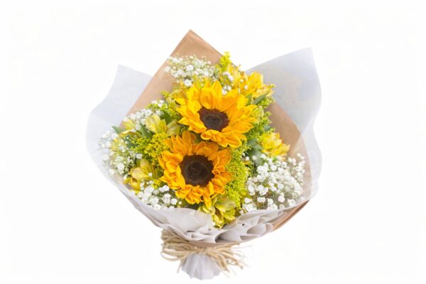 Mini buquê com 2 girassóis, tango e gipsofila, em embalagem kraft com papel liso branco e laço ráfia.
