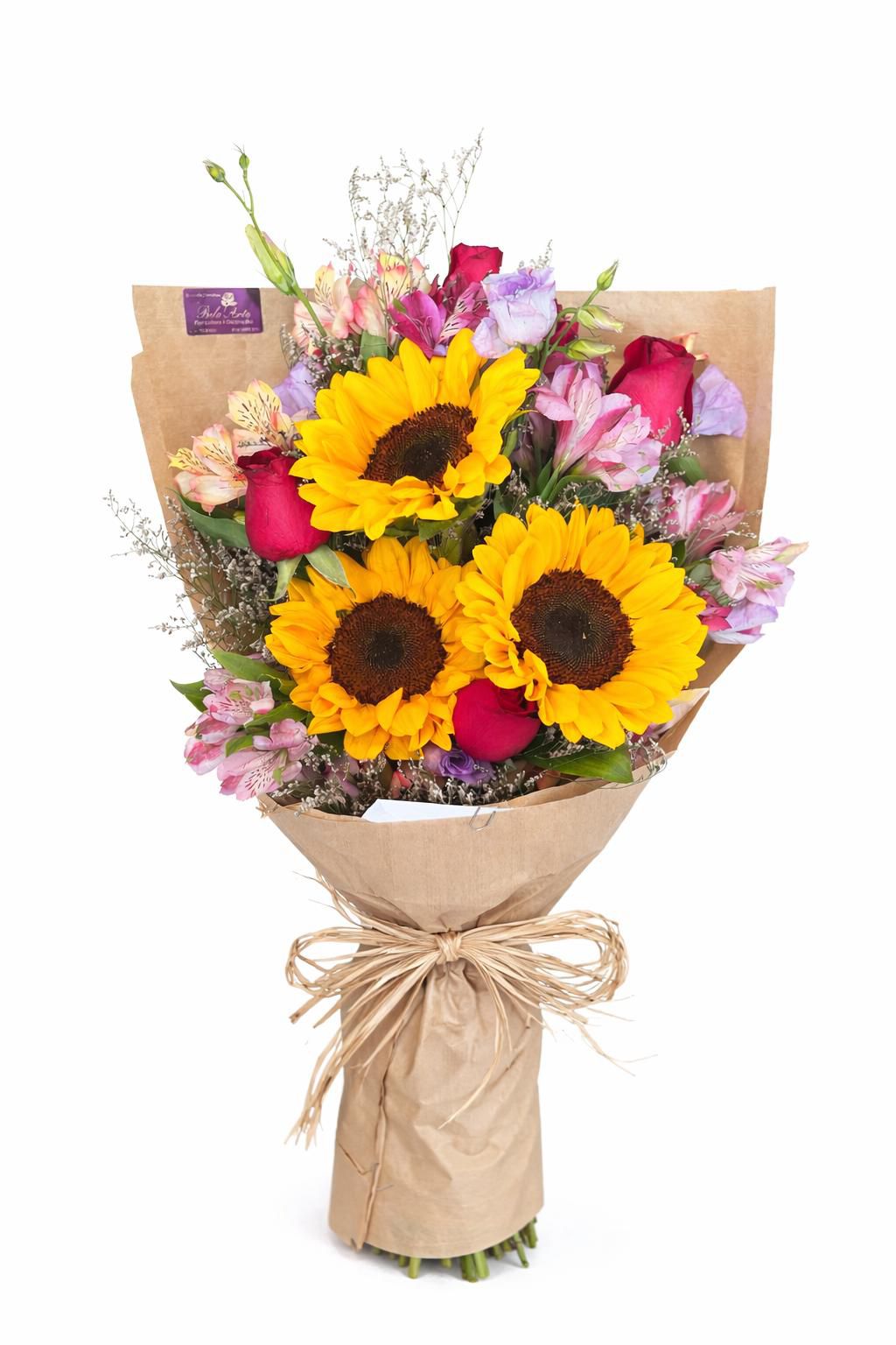 O Mini Girassol com Rosas é uma composição alegre e romântica, formada por 3 girassóis, 4 rosas vermelhas nacionais, alstroemérias nas cores rosa e lilás e complementos de limonium lilás, criando um arranjo leve e harmonioso. A embalagem em papel kraft valoriza o estilo natural do buquê, enquanto o laço de ráfia finaliza com um toque rústico e encantador.