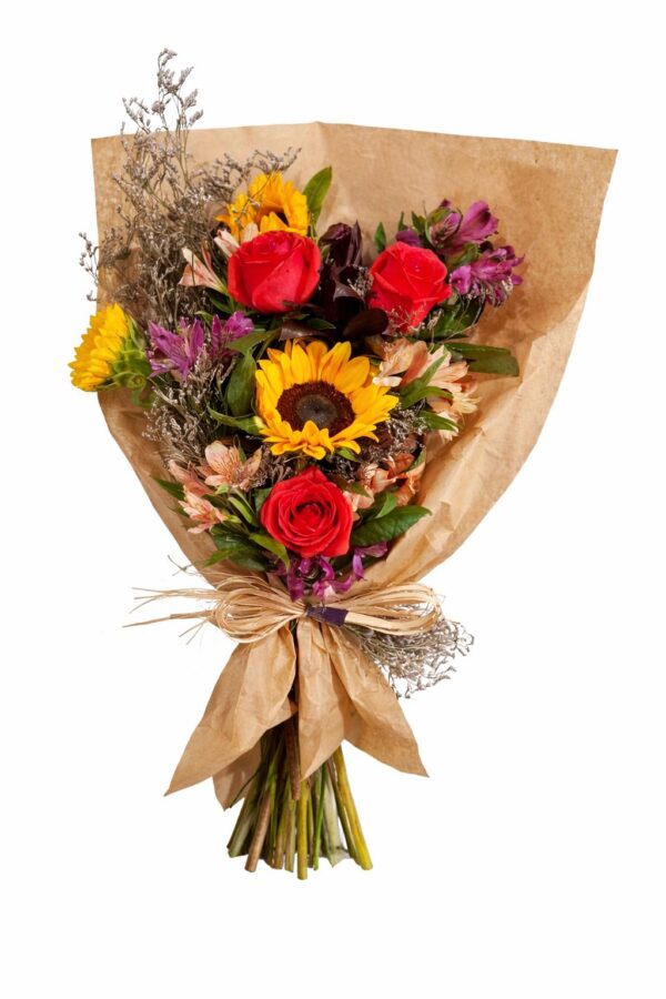 O Mini Girassol Soft é uma composição leve e harmoniosa, formada por 3 rosas laranja nacionais, 3 girassóis, alstroemérias nas cores chá e pink e complementos de limonium pink, criando um visual alegre e delicado. A embalagem em papel kraft valoriza o estilo natural do buquê, enquanto o laço de ráfia finaliza com um toque rústico e encantador.