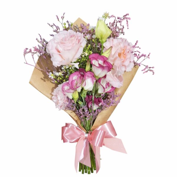 O Mini Silvestre Carinho é uma composição delicada e romântica, formada por lisianthus rosa e rosa com branco, acompanhados por limonium lilás, criando um visual leve e encantador. A embalagem em papel kraft valoriza o estilo natural do arranjo, enquanto o laço liso na cor rosa finaliza com um toque suave e harmonioso.
