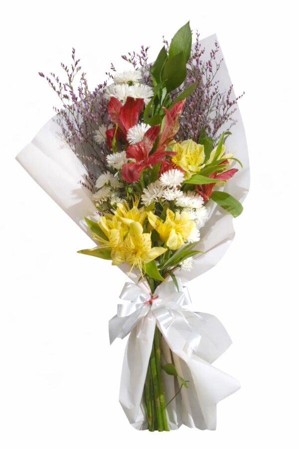 O Mini Silvestre Raiz é uma composição leve e natural, formada por alstroemérias marsala e amarela, limonium pink, áster mariano e ruscus, criando um arranjo delicado com estilo silvestre. A embalagem bege valoriza a proposta rústica e elegante, enquanto o laço de TNT branco finaliza com um toque suave e harmonioso.