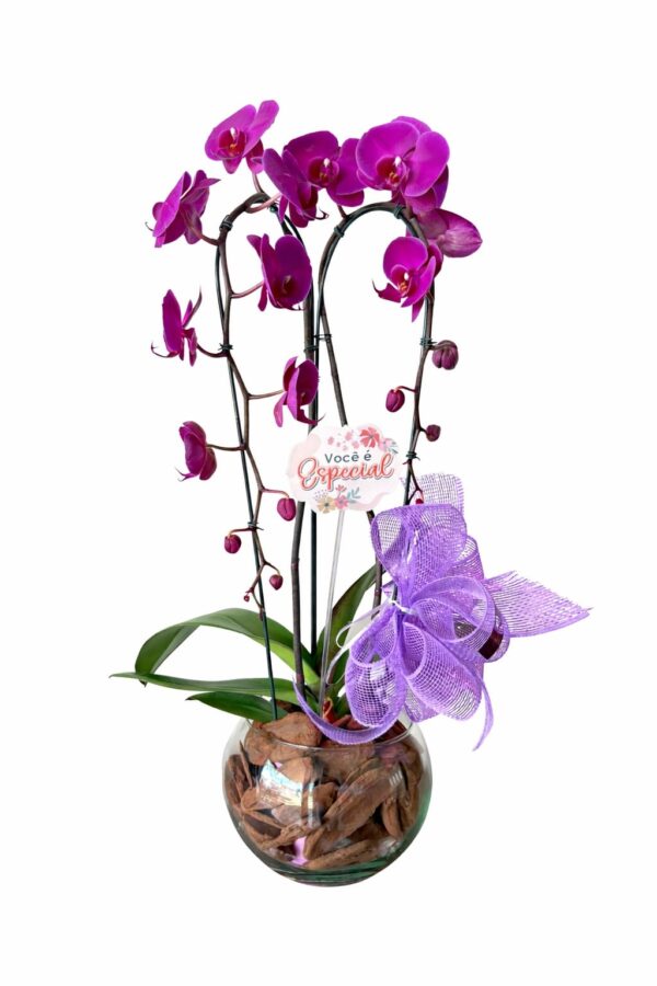 Orquídea decorada no aquário de vidro com casca de pinus, laço de renda lilás e placa com dizeres (mensagens podem variar de acordo com a ocasião).