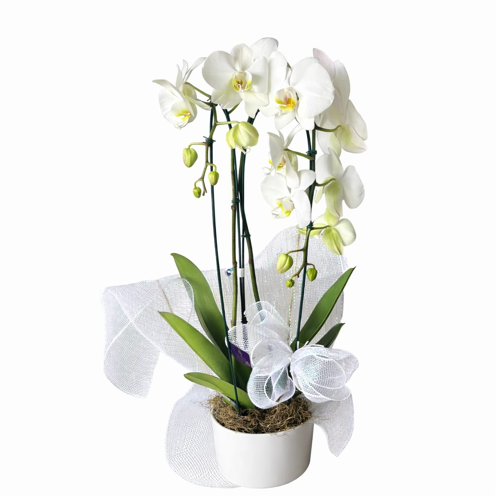 Breve descrição: Orquídea branca em cachepot acrílico.