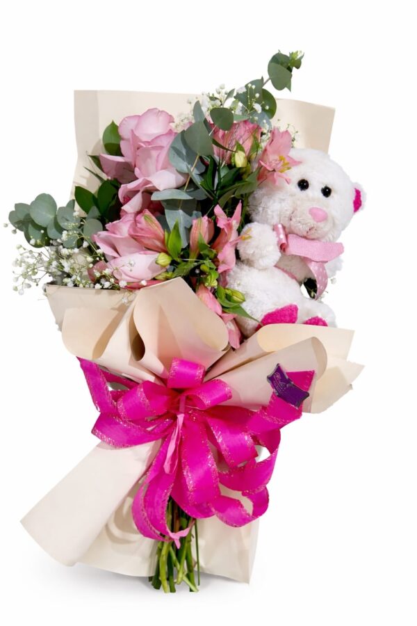 O Solitário Carinhoso é uma composição delicada e romântica, formada por 2 rosas rosa importadas, alstroemérias rosa, eucalipto e gipsofila, criando um visual leve e harmonioso. Acompanha um urso pequeno que torna o presente ainda mais especial. A embalagem lisa creme valoriza a suavidade das flores, enquanto o laço de TNT rosa finaliza com um toque encantador.