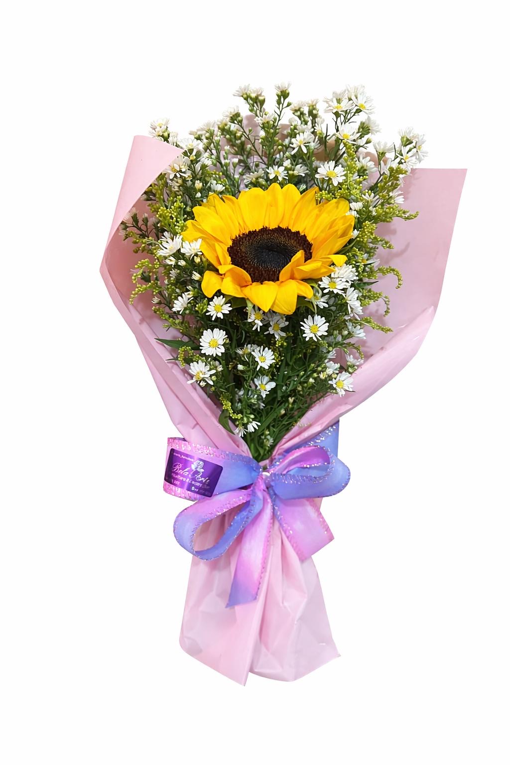 o solitario girassol raio de luz traz a beleza alegre do girassol combinada com a delicadeza do áster e do tango, criando uma composição leve e encantadora. A embalagem lisa valoriza o destaque das flores, enquanto o laço de TNT lilás e rosa acrescenta um toque suave e harmonioso ao arranjo. Uma opção perfeita para presentear com carinho, transmitir alegria ou iluminar qualquer ambient