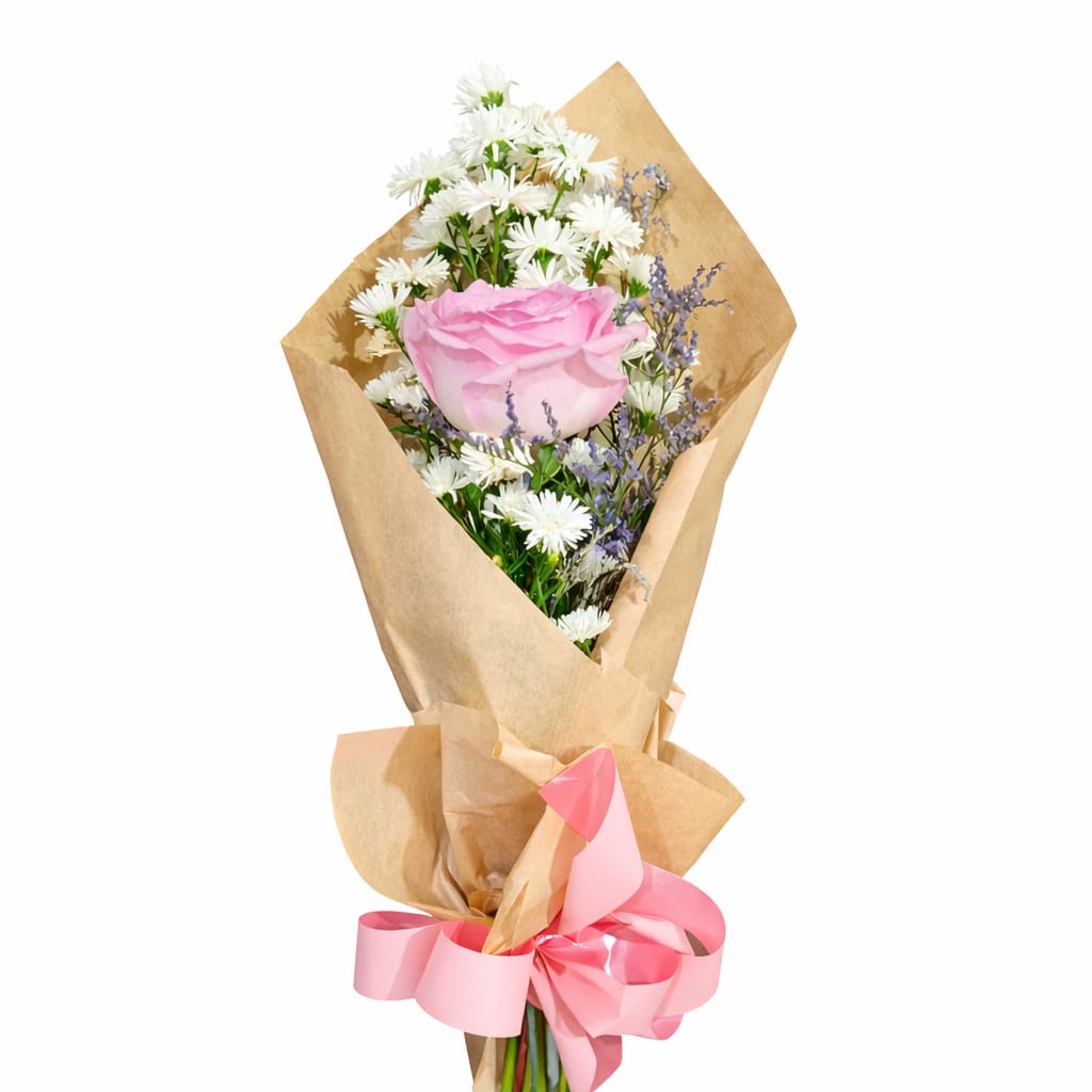 O Solitário Rosé Kraft é uma composição delicada e romântica, formada por 1 rosa rosa importada acompanhada por áster mariano, criando um visual leve e harmonioso. A embalagem em papel kraft valoriza o estilo natural do arranjo, enquanto o laço de TNT na cor rosa finaliza com um toque suave e encantador